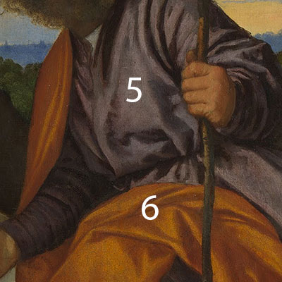 6 Joseph’s orange cloak: khaki brown underpaint layer contains black, lead white and yellow ochre. The next layer consists of orange ochre and is then overpainted by realgar and probably also orpiment.